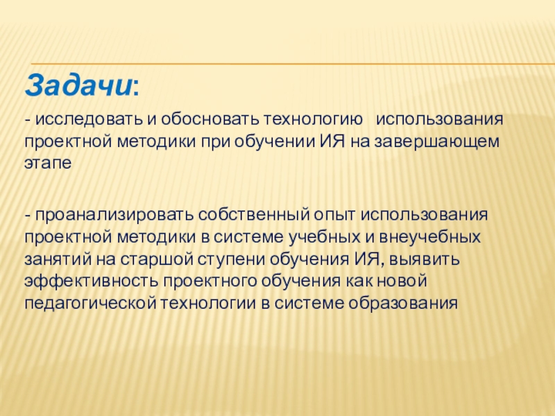 - проанализировать собственный опыт использования проектной методики в системе учебных и внеучебных занятий на старшой ступени обучения ИЯ, выявить эффективность проектного обучения как новой педагогической технологии в системе образования