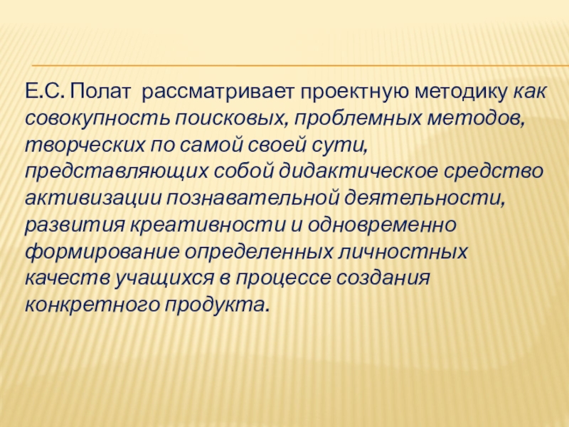 Слайд 10Е.С. Полат рассматривает проектную методику как совокупность поисковых, проблемных методов, творческих