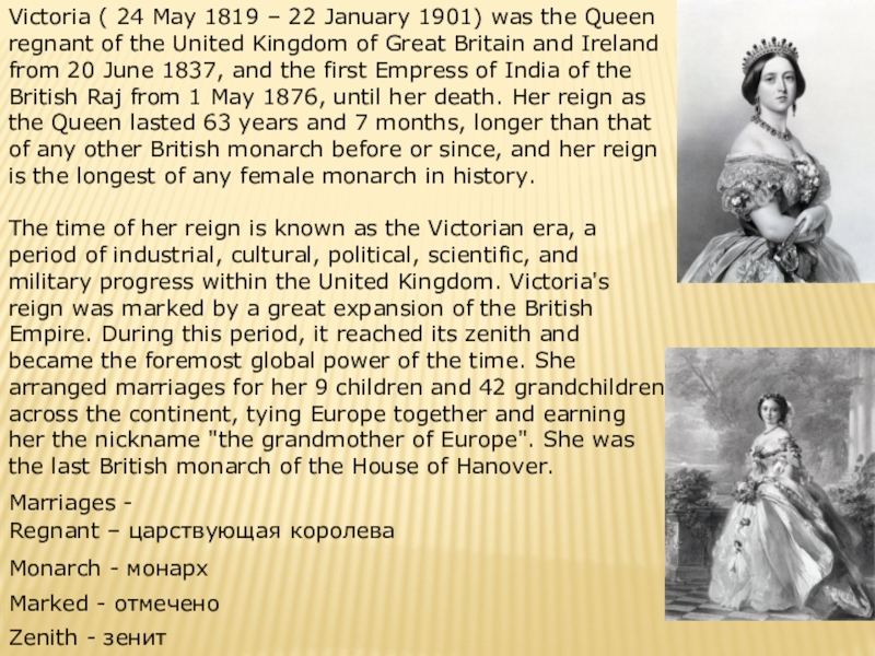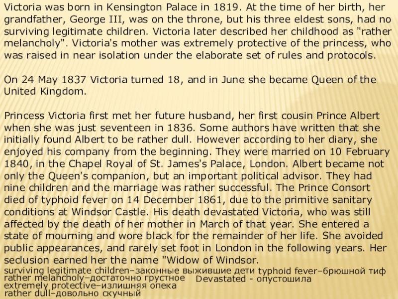 of her birth, her grandfather, George III, was on the throne, but his three eldest sons, had no surviving legitimate children. Victoria later described her childhood as "rather melancholy". Victoria's mother was extremely protective of the princess, who was raised in near isolation under the elaborate set of rules and protocols.