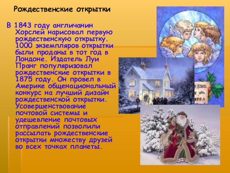 Издатель Луис Пранг распространил в Америке английскую традицию слать друзьям и родственникам на Рождество поздравительные открытки.