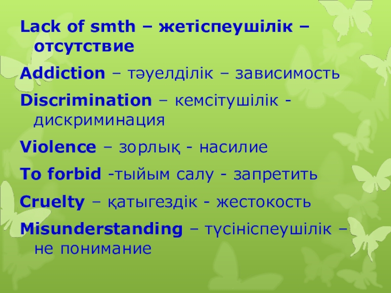 Lack of smth – жетіспеушілік – отсутствие Addiction – тәуелділік – зависимостьDiscrimination – кемсітушілік - дискриминация Violence