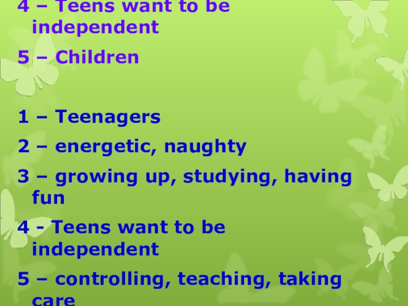 1 – Teenagers2 – active, aggressive 3 – growing up, dancing, walking4 – Teens want to be