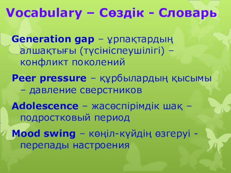 Vocabulary – Сөздік - Словарь Generation gap – ұрпақтардың алшақтығы (түсініспеушілігі) – конфликт поколений Peer pressure –