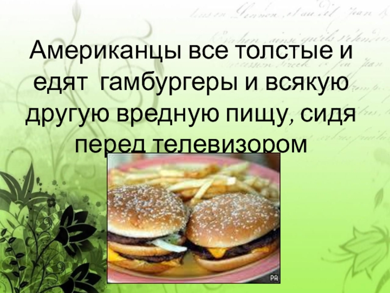 Слайд 2Американцы все толстые и едят гамбургеры и всякую другую вредную пищу,