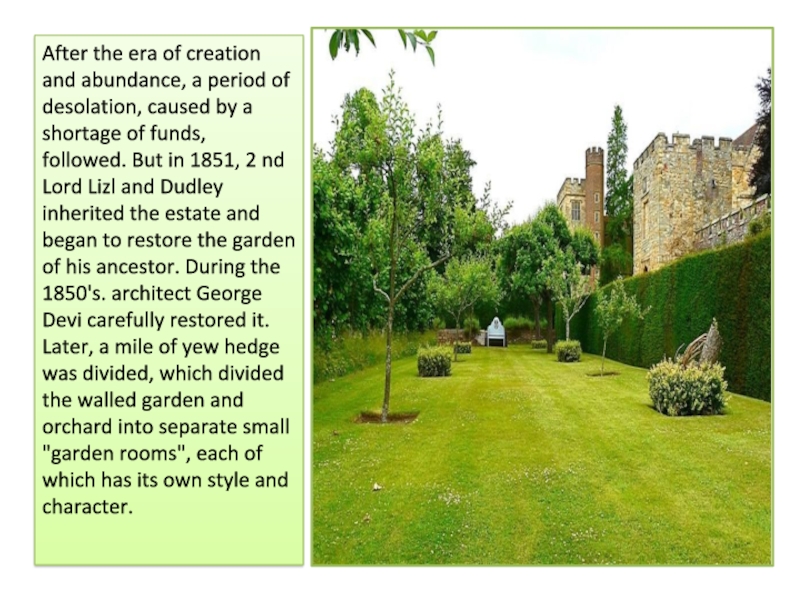 caused by a shortage of funds, followed. But in 1851, 2 nd Lord Lizl and Dudley inherited the estate and began to restore the garden of his ancestor. During the 1850's. architect George Devi carefully restored it. Later, a mile of yew hedge was divided, which divided the walled garden and orchard into separate small "garden rooms", each of which has its own style and character.