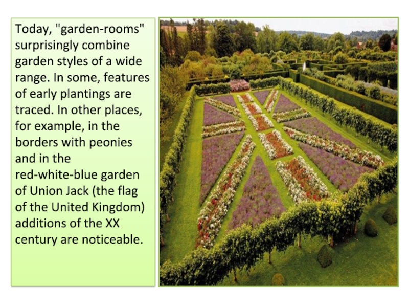 Слайд 4Today, "garden-rooms" surprisingly combine garden styles of a wide range. In