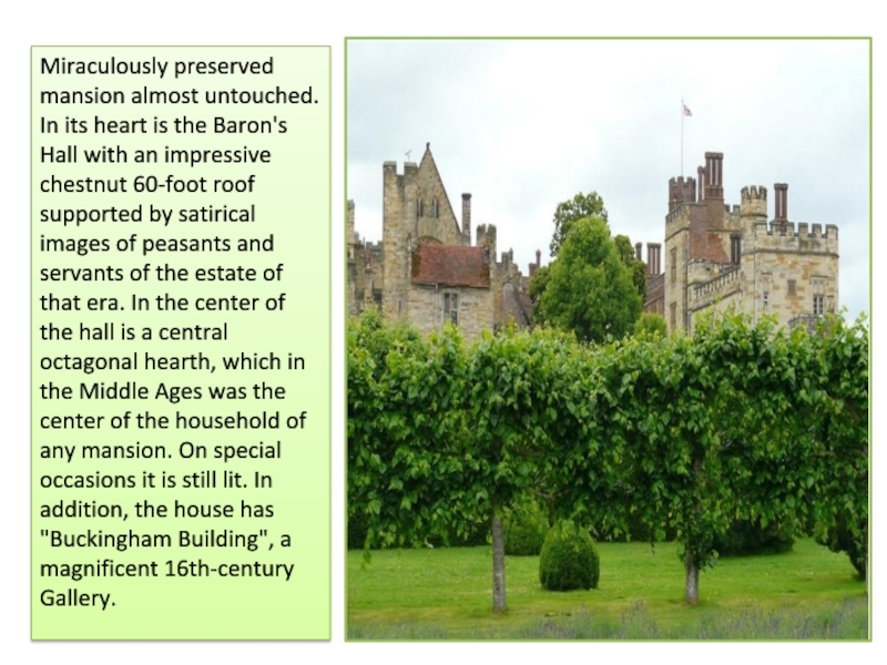 Hall with an impressive chestnut 60-foot roof supported by satirical images of peasants and servants of the estate of that era. In the center of the hall is a central octagonal hearth, which in the Middle Ages was the center of the household of any mansion. On special occasions it is still lit. In addition, the house has "Buckingham Building", a magnificent 16th-century Gallery.