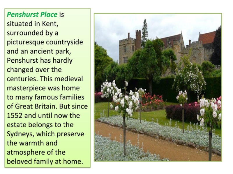 Слайд 5Penshurst Place is situated in Kent, surrounded by a picturesque countryside