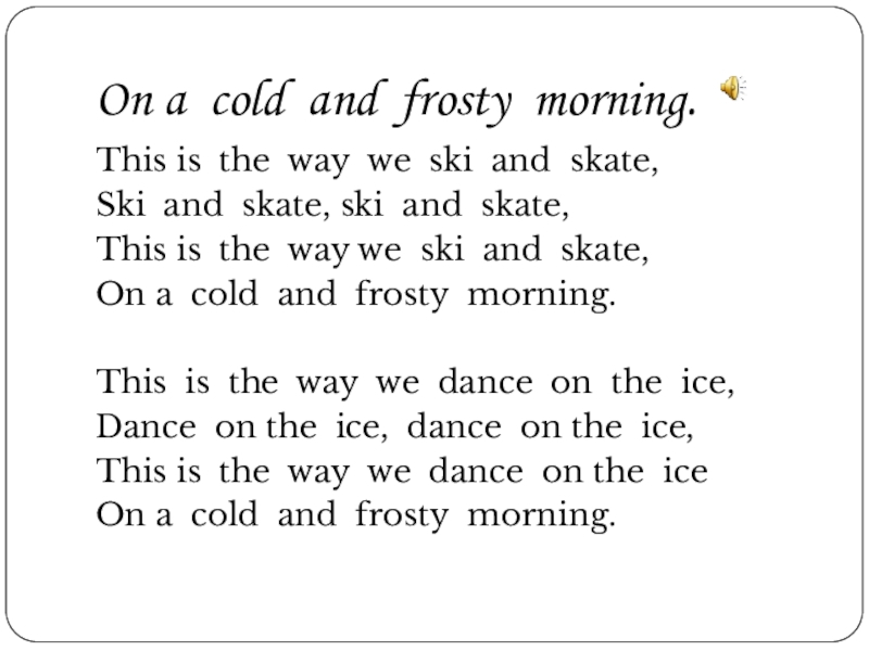 On a cold and frosty morning.This is the way we ski and skate,Ski and skate, ski