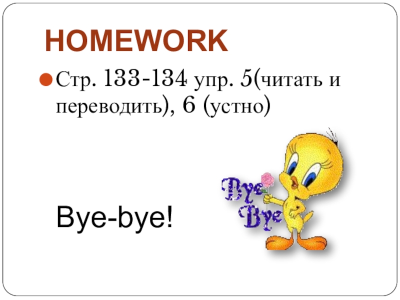 HOMEWORKСтр. 133-134 упр. 5(читать и переводить), 6 (устно)    Bye-bye!