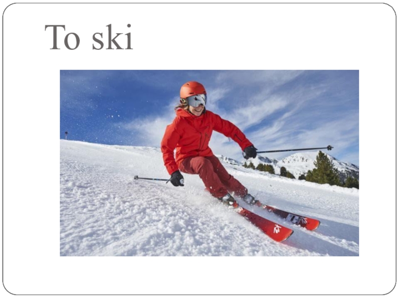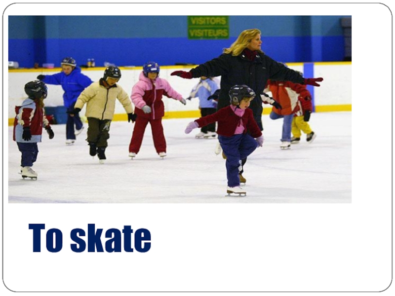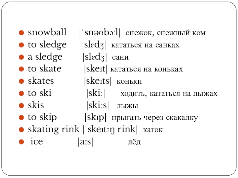 snowball |ˈsnəʊbɔːl| снежок, снежный комto sledge |slɛdʒ| кататься на санках a sledge |slɛdʒ| саниto skate |skeɪt| кататься на коньках skates