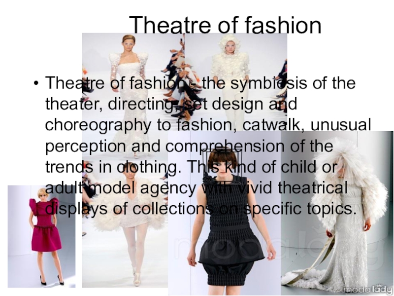 Theatre of fashionTheatre of fashion - the symbiosis of the theater, directing, set design and choreography to