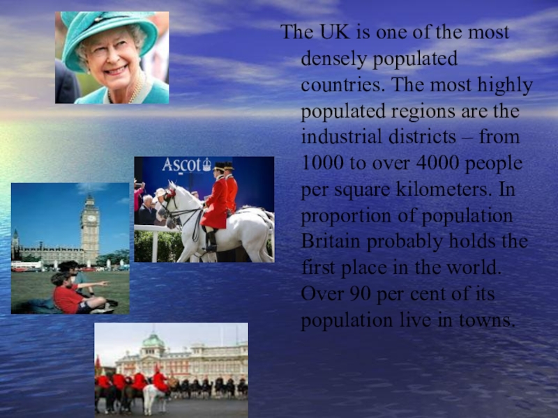 most highly populated regions are the industrial districts – from 1000 to over 4000 people per square kilometers. In proportion of population Britain probably holds the first place in the world. Over 90 per cent of its population live in towns.