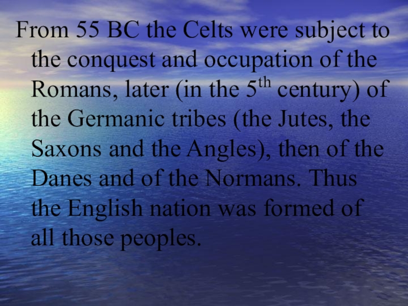 occupation of the Romans, later (in the 5th century) of the Germanic tribes (the Jutes, the Saxons and the Angles), then of the Danes and of the Normans. Thus the English nation was formed of all those peoples.