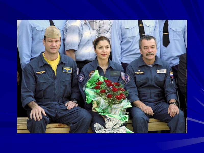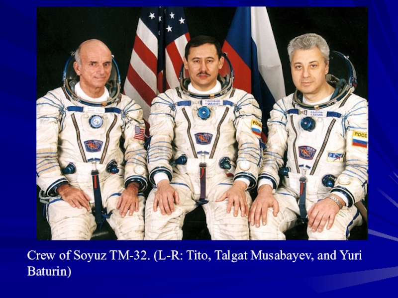 Слайд 10Crew of Soyuz TM-32. (L-R: Tito, Talgat Musabayev, and Yuri Baturin)