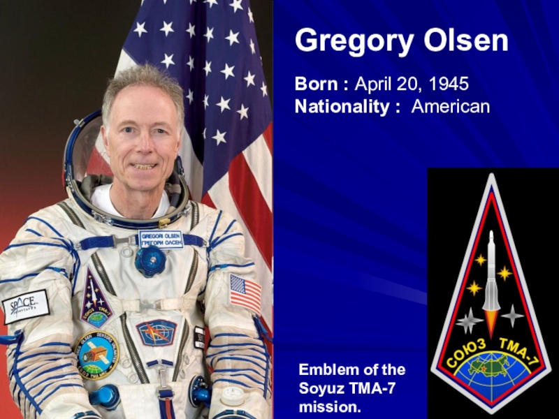 will fly to the ISS as the sixth space tourist to the Russian spacecraft Soyuz TMA-13 (pre-launch date - October 12, 2008) and will return to Earth on the Soyuz TMA-12.On became the first space tourist, who spent scientific experiments on the ISS, commissioned by private organizations and spacewalk.