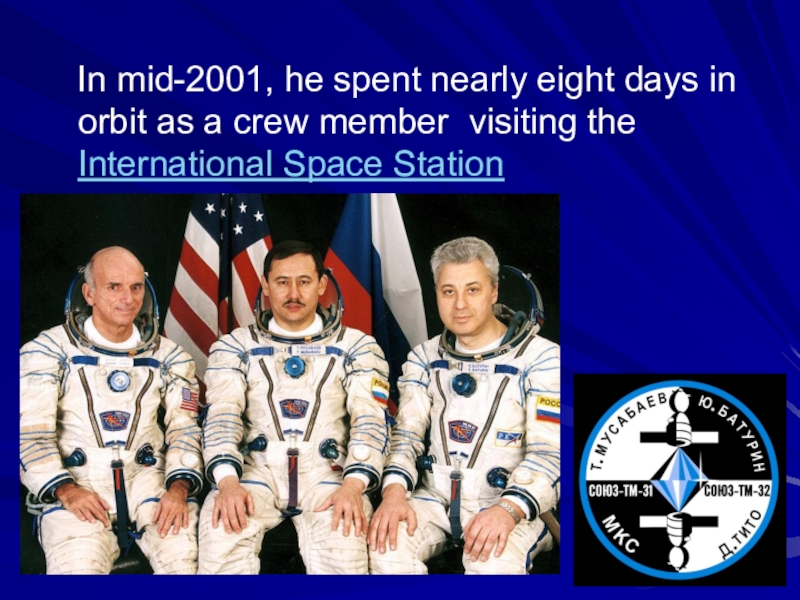 Слайд 9 In mid-2001, he spent nearly eight days in orbit