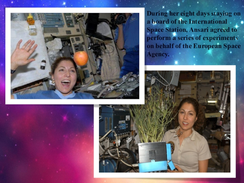 Space Station, Ansari agreed to perform a series of experiments on behalf of the European Space Agency.