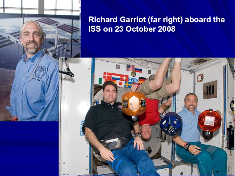 Слайд 23Richard Garriot (far right) aboard the ISS on 23 October 2008