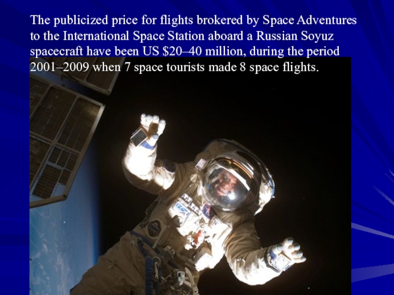 Слайд 6The publicized price for flights brokered by Space Adventures to the International Space