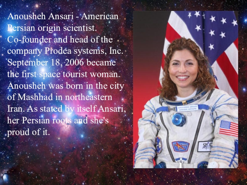 Слайд 15Anousheh Ansari - American Persian origin scientist. Co-founder and head of