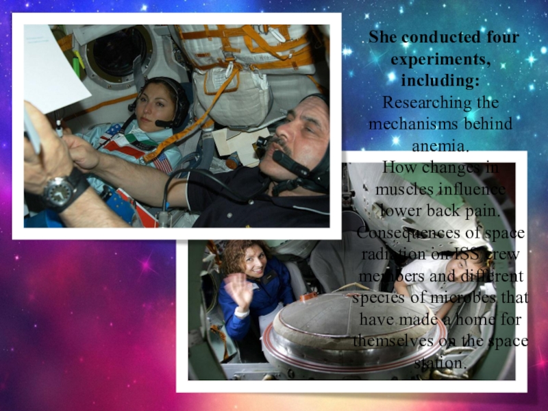 Consequences of space radiation on ISS crew members and different species of microbes that have made a home for themselves on the space station.