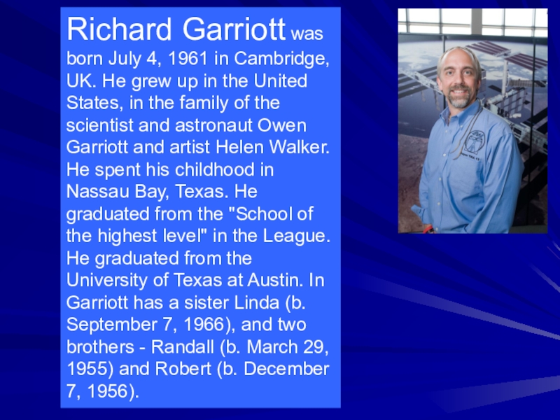 Слайд 21Richard Garriott was born July 4, 1961 in Cambridge, UK. He