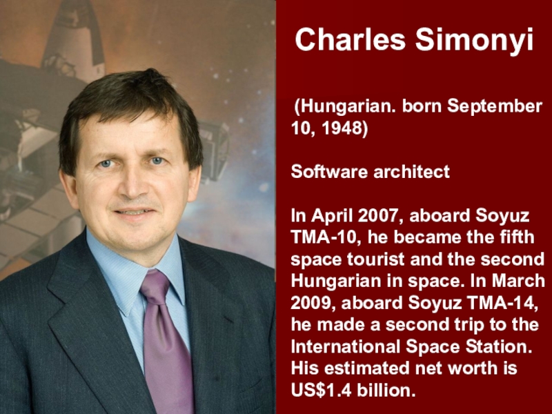 aboard Soyuz TMA-10, he became the fifth space tourist and the second Hungarian in space. In March 2009, aboard Soyuz TMA-14, he made a second trip to the International Space Station. His estimated net worth is US$1.4 billion.