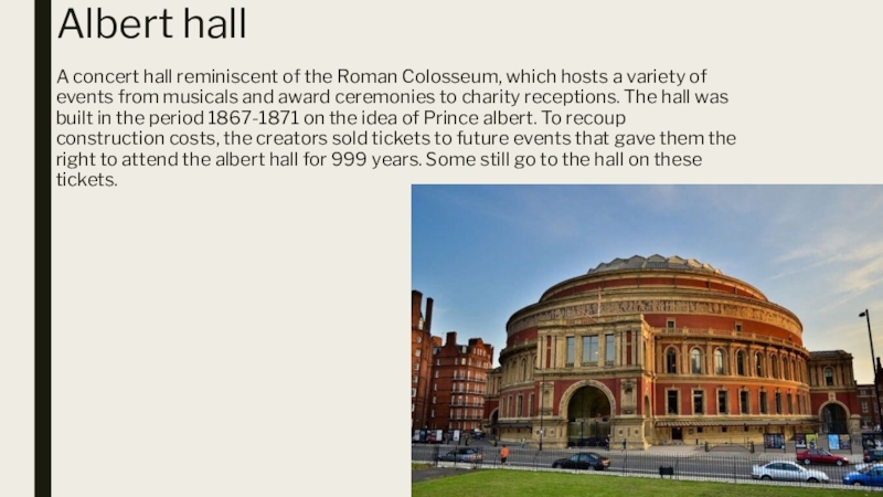 a variety of events from musicals and award ceremonies to charity receptions. The hall was built in the period 1867-1871 on the idea of Prince albert. To recoup construction costs, the creators sold tickets to future events that gave them the right to attend the albert hall for 999 years. Some still go to the hall on these tickets.