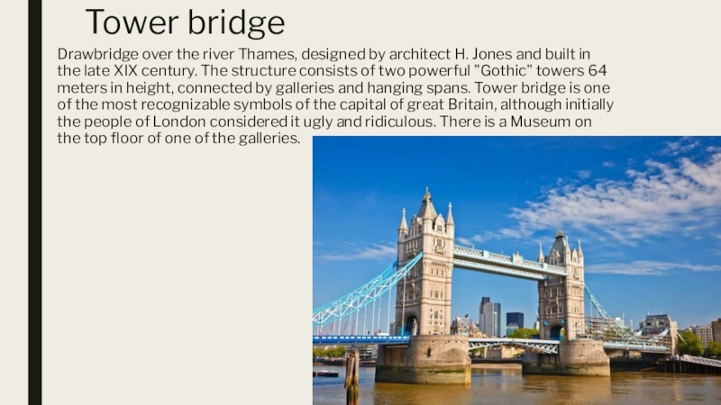 and built in the late XIX century. The structure consists of two powerful "Gothic" towers 64 meters in height, connected by galleries and hanging spans. Tower bridge is one of the most recognizable symbols of the capital of great Britain, although initially the people of London considered it ugly and ridiculous. There is a Museum on the top floor of one of the galleries.
