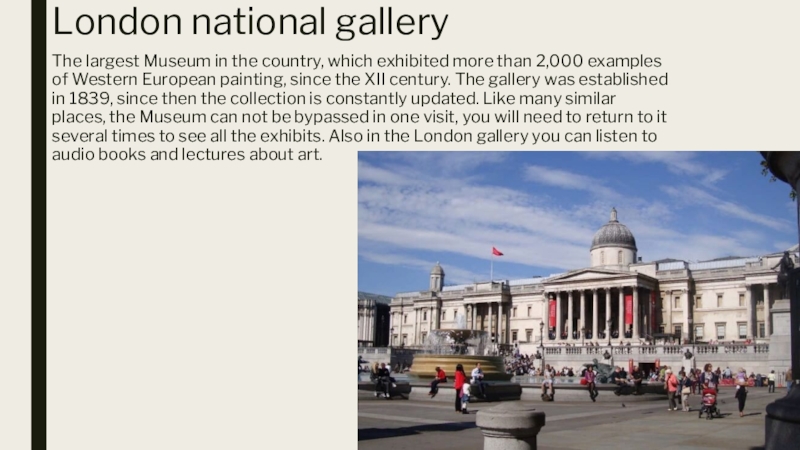 than 2,000 examples of Western European painting, since the XII century. The gallery was established in 1839, since then the collection is constantly updated. Like many similar places, the Museum can not be bypassed in one visit, you will need to return to it several times to see all the exhibits. Also in the London gallery you can listen to audio books and lectures about art.