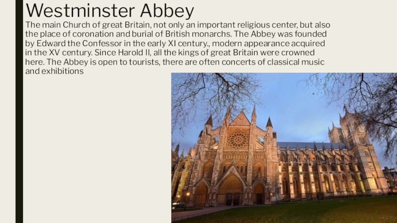 religious center, but also the place of coronation and burial of British monarchs. The Abbey was founded by Edward the Confessor in the early XI century., modern appearance acquired in the XV century. Since Harold II, all the kings of great Britain were crowned here. The Abbey is open to tourists, there are often concerts of classical music and exhibitions