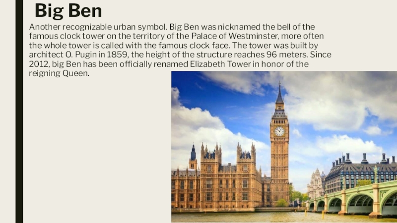 of the famous clock tower on the territory of the Palace of Westminster, more often the whole tower is called with the famous clock face. The tower was built by architect O. Pugin in 1859, the height of the structure reaches 96 meters. Since 2012, big Ben has been officially renamed Elizabeth Tower in honor of the reigning Queen.