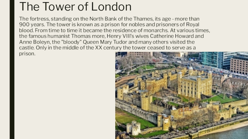 the Thames, its age - more than 900 years. The tower is known as a prison for nobles and prisoners of Royal blood. From time to time it became the residence of monarchs. At various times, the famous humanist Thomas more, Henry VIII's wives Catherine Howard and Anne Boleyn, the "bloody" Queen Mary Tudor and many others visited the castle. Only in the middle of the XX century the tower ceased to serve as a prison.