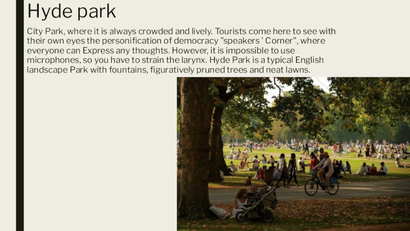come here to see with their own eyes the personification of democracy "speakers ' Corner", where everyone can Express any thoughts. However, it is impossible to use microphones, so you have to strain the larynx. Hyde Park is a typical English landscape Park with fountains, figuratively pruned trees and neat lawns.