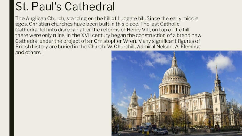 hill. Since the early middle ages, Christian churches have been built in this place. The last Catholic Cathedral fell into disrepair after the reforms of Henry VIII, on top of the hill there were only ruins. In the XVII century began the construction of a brand new Cathedral under the project of sir Christopher Wren. Many significant figures of British history are buried in the Church: W. Churchill, Admiral Nelson, A. Fleming and others.