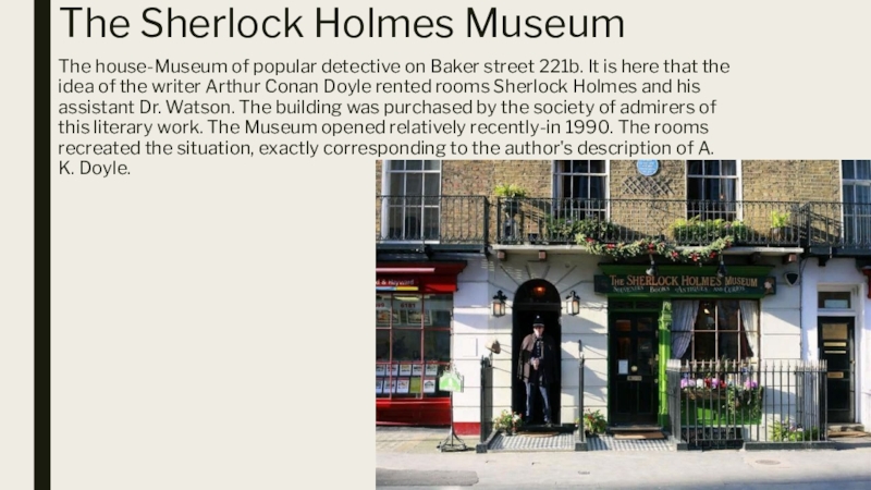 221b. It is here that the idea of the writer Arthur Conan Doyle rented rooms Sherlock Holmes and his assistant Dr. Watson. The building was purchased by the society of admirers of this literary work. The Museum opened relatively recently-in 1990. The rooms recreated the situation, exactly corresponding to the author's description of A. K. Doyle.