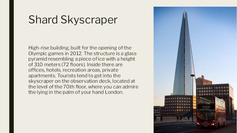 in 2012. The structure is a glass pyramid resembling a piece of ice with a height of 310 meters (72 floors). Inside there are offices, hotels, recreation areas, private apartments. Tourists tend to get into the skyscraper on the observation deck, located at the level of the 70th floor, where you can admire the lying in the palm of your hand London.