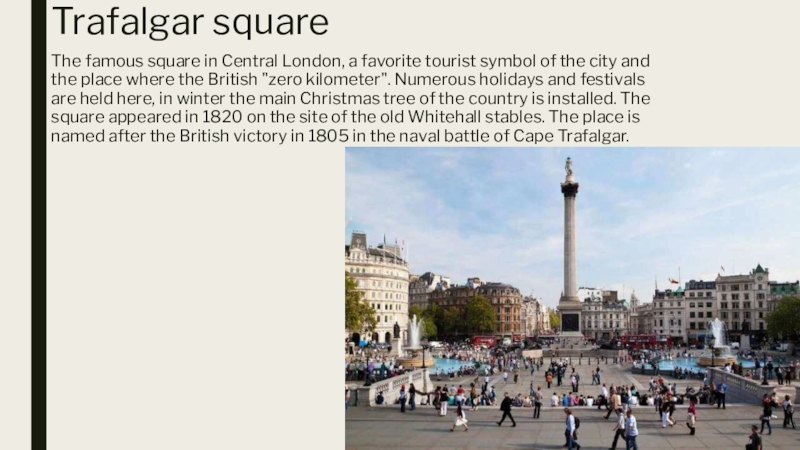 of the city and the place where the British "zero kilometer". Numerous holidays and festivals are held here, in winter the main Christmas tree of the country is installed. The square appeared in 1820 on the site of the old Whitehall stables. The place is named after the British victory in 1805 in the naval battle of Cape Trafalgar.