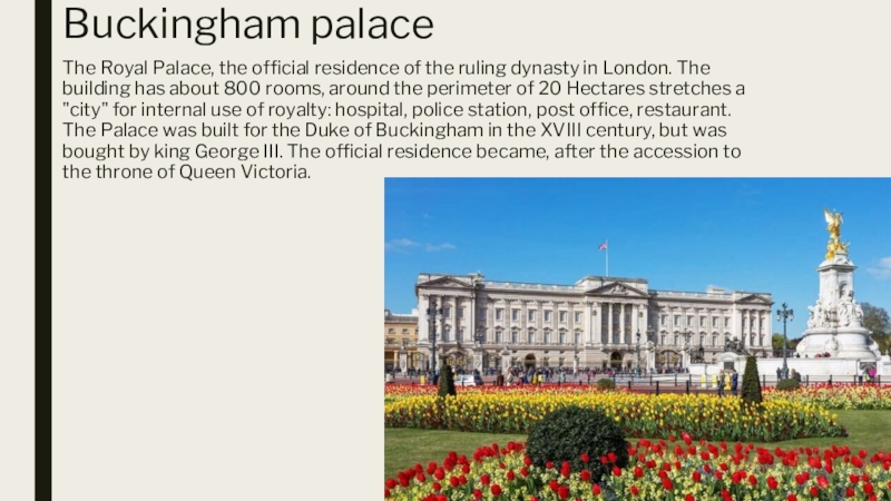 in London. The building has about 800 rooms, around the perimeter of 20 Hectares stretches a "city" for internal use of royalty: hospital, police station, post office, restaurant. The Palace was built for the Duke of Buckingham in the XVIII century, but was bought by king George III. The official residence became, after the accession to the throne of Queen Victoria.