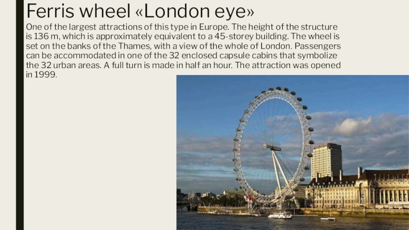 in Europe. The height of the structure is 136 m, which is approximately equivalent to a 45-storey building. The wheel is set on the banks of the Thames, with a view of the whole of London. Passengers can be accommodated in one of the 32 enclosed capsule cabins that symbolize the 32 urban areas. A full turn is made in half an hour. The attraction was opened in 1999.
