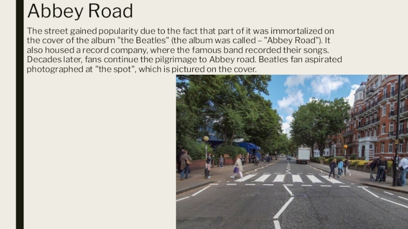 of it was immortalized on the cover of the album "the Beatles" (the album was called – "Abbey Road"). It also housed a record company, where the famous band recorded their songs. Decades later, fans continue the pilgrimage to Abbey road. Beatles fan aspirated photographed at "the spot", which is pictured on the cover.