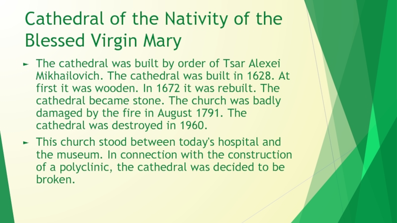 built by order of Tsar Alexei Mikhailovich. The cathedral was built in 1628. At first it was wooden. In 1672 it was rebuilt. The cathedral became stone. The church was badly damaged by the fire in August 1791. The cathedral was destroyed in 1960.