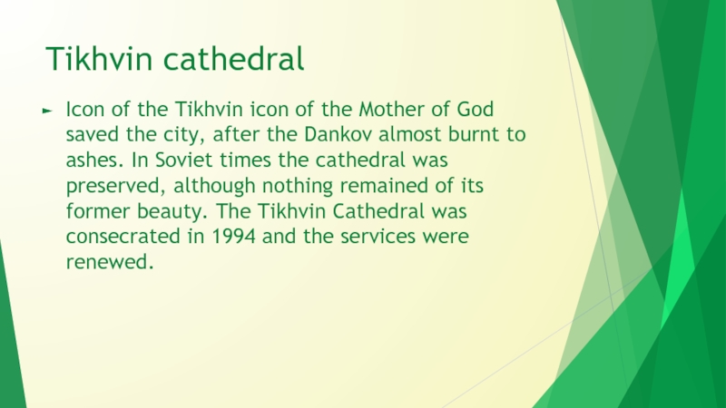 saved the city, after the Dankov almost burnt to ashes. In Soviet times the cathedral was preserved, although nothing remained of its former beauty. The Tikhvin Cathedral was consecrated in 1994 and the services were renewed.
