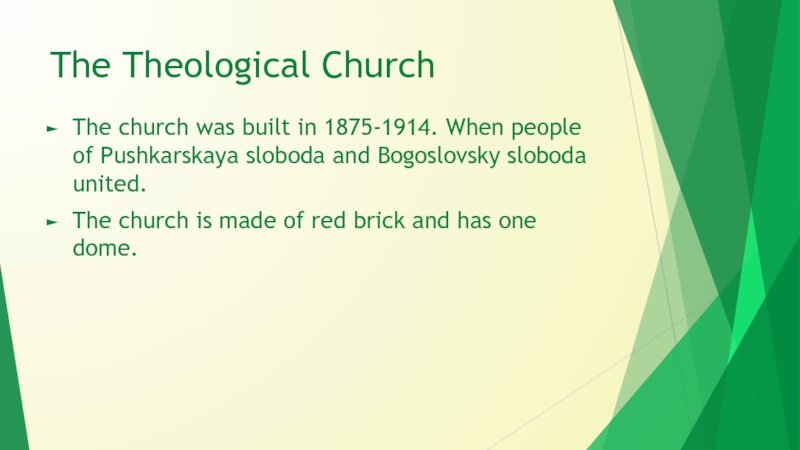 The Theological ChurchThe church was built in 1875-1914. When people of Pushkarskaya sloboda and Bogoslovsky sloboda united.The