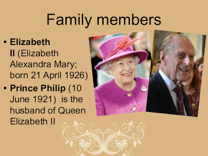 Family membersElizabeth II (Elizabeth Alexandra Mary; born 21 April 1926)Prince Philip (10 June 1921) is the husband of