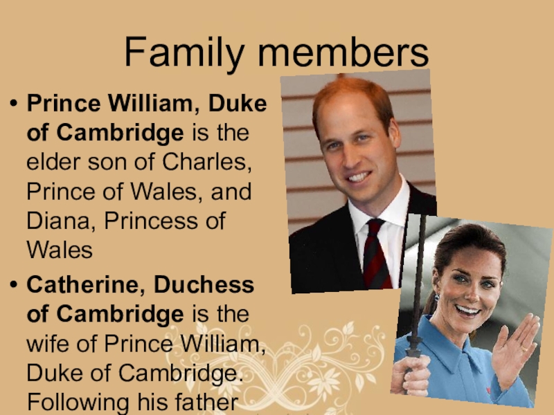 Family membersPrince William, Duke of Cambridge is the elder son of Charles, Prince of Wales, and Diana,