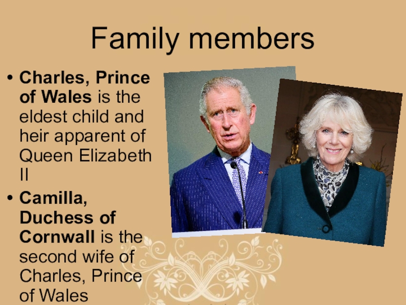 Family membersCharles, Prince of Wales is the eldest child and heir apparent of Queen Elizabeth IICamilla, Duchess