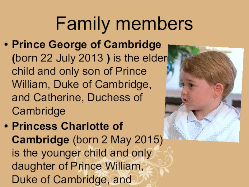 Family membersPrince George of Cambridge (born 22 July 2013 ) is the elder child and only son