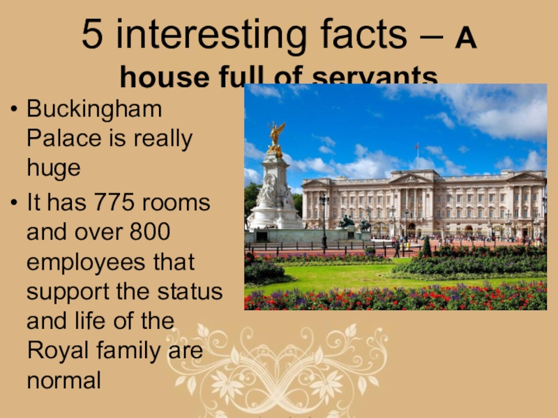 5 interesting facts – A house full of servantsBuckingham Palace is really hugeIt has 775 rooms and